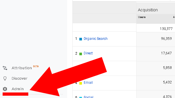 As with all Google products, we’ll need to login before we can do anything, so, firstly, go to https://analytics.google.com/ and log in to the account that you’d like to analyse search tracking on.  Now you’ve logged into the account you’d like to add search tracking to, look at the left-hand pane of Google Analytics for the “Admin” option and select it: