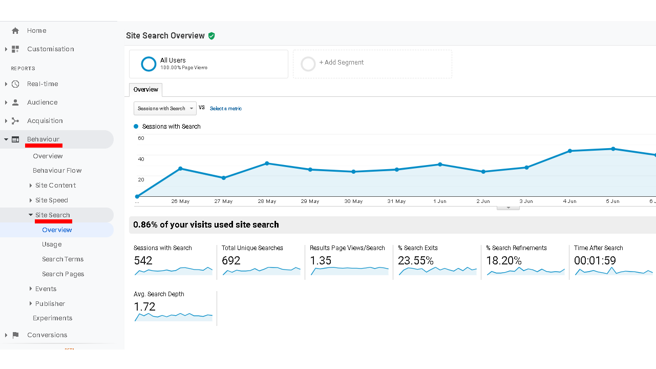 Now, to access site search reports go to Behavior > Site Search > Overview